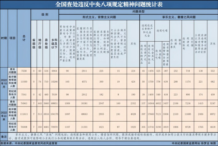 11月27日,中央紀(jì)委國(guó)家監(jiān)委公布了2022年10月全國(guó)查處違反中央八項(xiàng)規(guī)定精神問題匯總情況。今年10月,全國(guó)共查處違反中央八項(xiàng)規(guī)定精神問題7558起,批評(píng)教育幫助和處理11050人,其中,黨紀(jì)政務(wù)處分7541人,這是連續(xù)第110個(gè)月公布月報(bào)數(shù)據(jù)。
