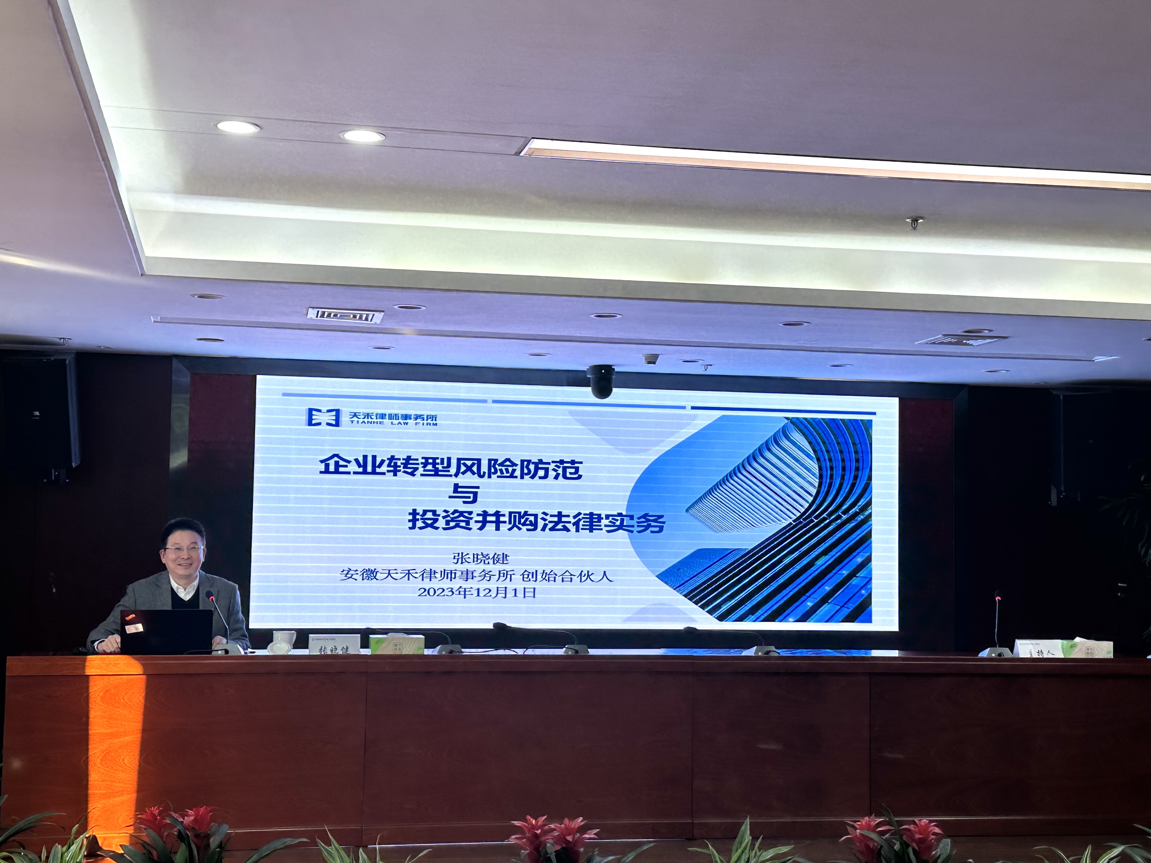培訓旨在弘揚憲法精神、培養員工合規管理意識、推動集團強化對投資并購問題集中領域的管控,防范和減少相關風險。安徽省人民政府法律顧問、安徽天禾律師事務所創始合伙人張曉健以“企業轉型風險防范與投資并購法律實務”為題展開專題講座。