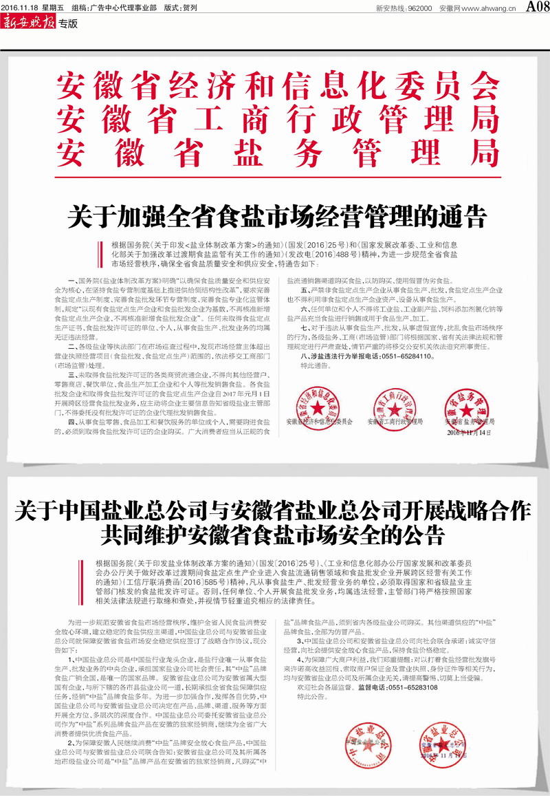1、完善食鹽定點生產制度和食鹽批發環節專營制度。不再核準新增食鹽定點生產企業,確保企業數量只減不增;堅持批發專營制度,以現有食鹽定點生產企業和食鹽批發企業為基數,不再核準新增食鹽批發企業。